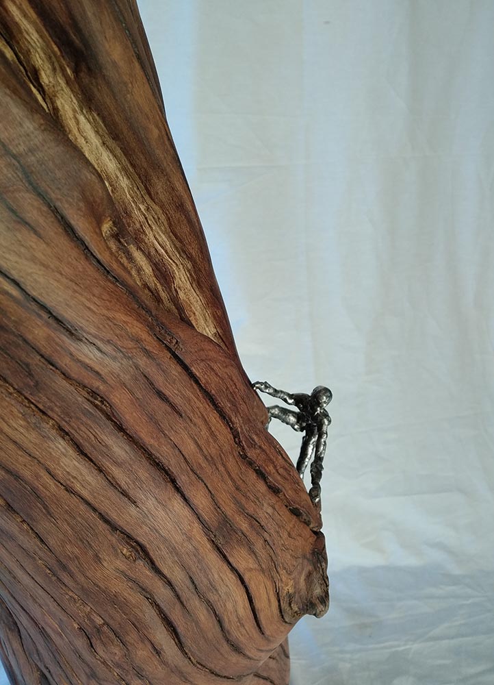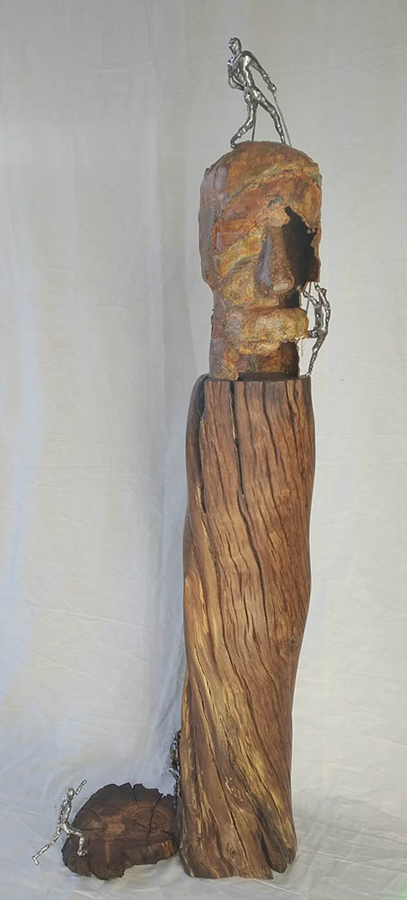 El segon artista d’aquesta setmana es diu Alfredo Zarazaga Jurado. Ell parla de la seva obra: “Quan entro en contacte amb una peça, diguem-ne descartada, ja sigui ferralla, fusta o qualsevol altre material, comença una mena de diàleg amb la peça. Proposa la seva naturalesa, la seva forma, el seu color, la seva textura, parla de la seva història, pel que va ser construïda o dissenyada, també mostra les marques del pas del temps. Per la meva part aporto pensaments, criteris, conceptes. A continuació, es genera un diàleg creatiu, i és quan apareix una peça única i perfecta en si. És llavors quan em acomiado i accepto que tenia una història amb mi.” Continua dient “Reconstrucció: és el moment en què tots hem de contribuir a reconstruir, reconstruir a partir d’allò que hem après, reconstruir a partir dels nostres errors, reconstruir per a tota la humanitat en comú, reconstruir sent conscients que pertanyem a un TOT, reconstruir per reconèixer els nostres vincles amb la natura, reconstruint una humanitat igualitària, reconstruint-nos des de les profunditats de cadascú i aportant així tot el millor que podem tenir, en definitiva, reconstruint entre totxs i per a totxs.” Els materials que va utilitzar per a l’obra d’art que podeu veure a continuació són una planxa de ferro, fusta d’un oliver i acer inoxidable.